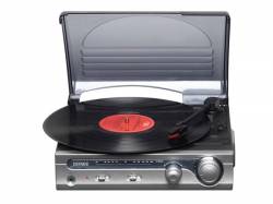 Tocadiscos con radio y altavoces incorporados, diseño retro. Permite convertir los vinilos en formato digital.